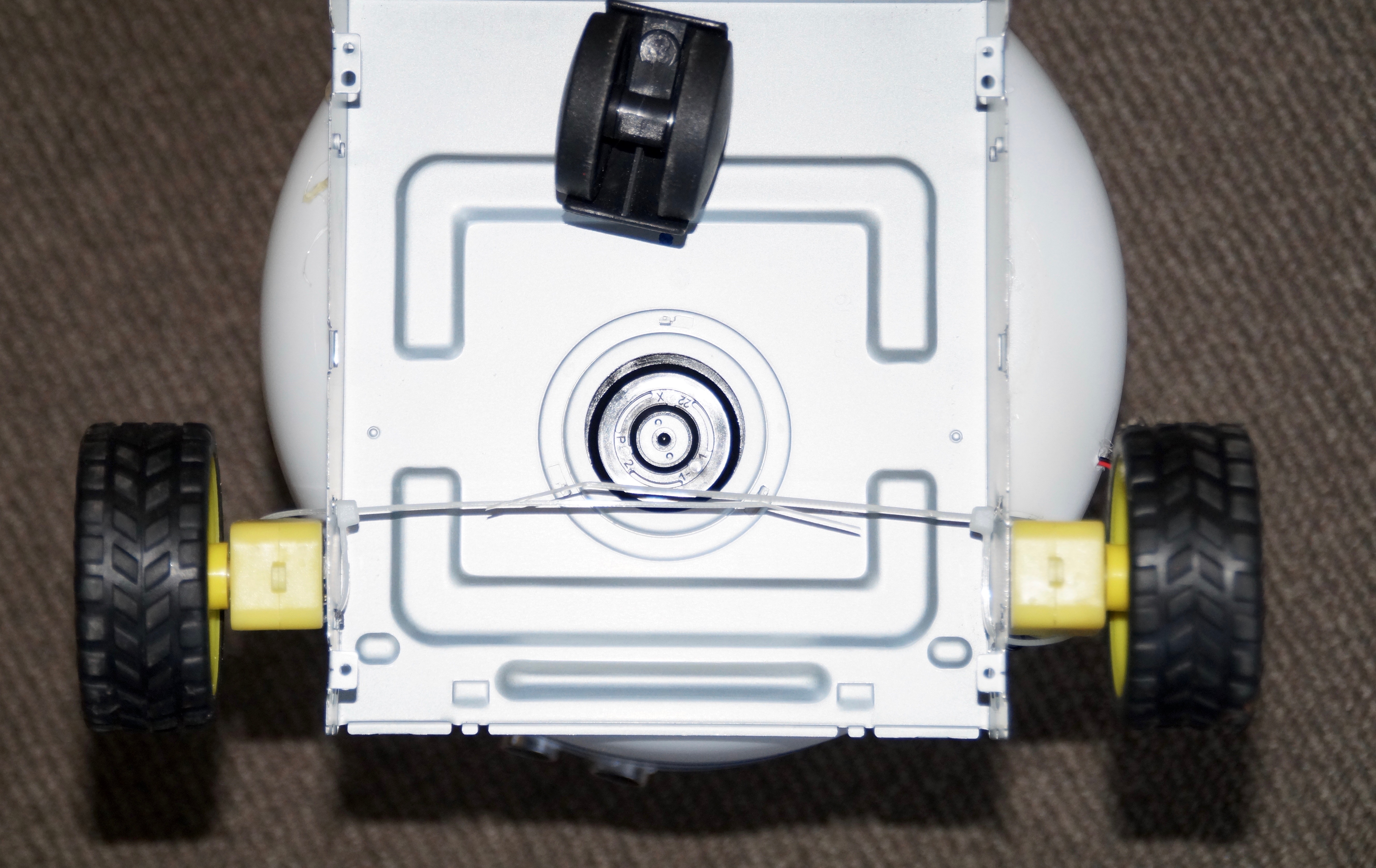 De basis is simpel. Het onderstel is gemaakt van een oude dvd speler Hierop zijn twee kleine motortjes bevestigd met tie wraps.