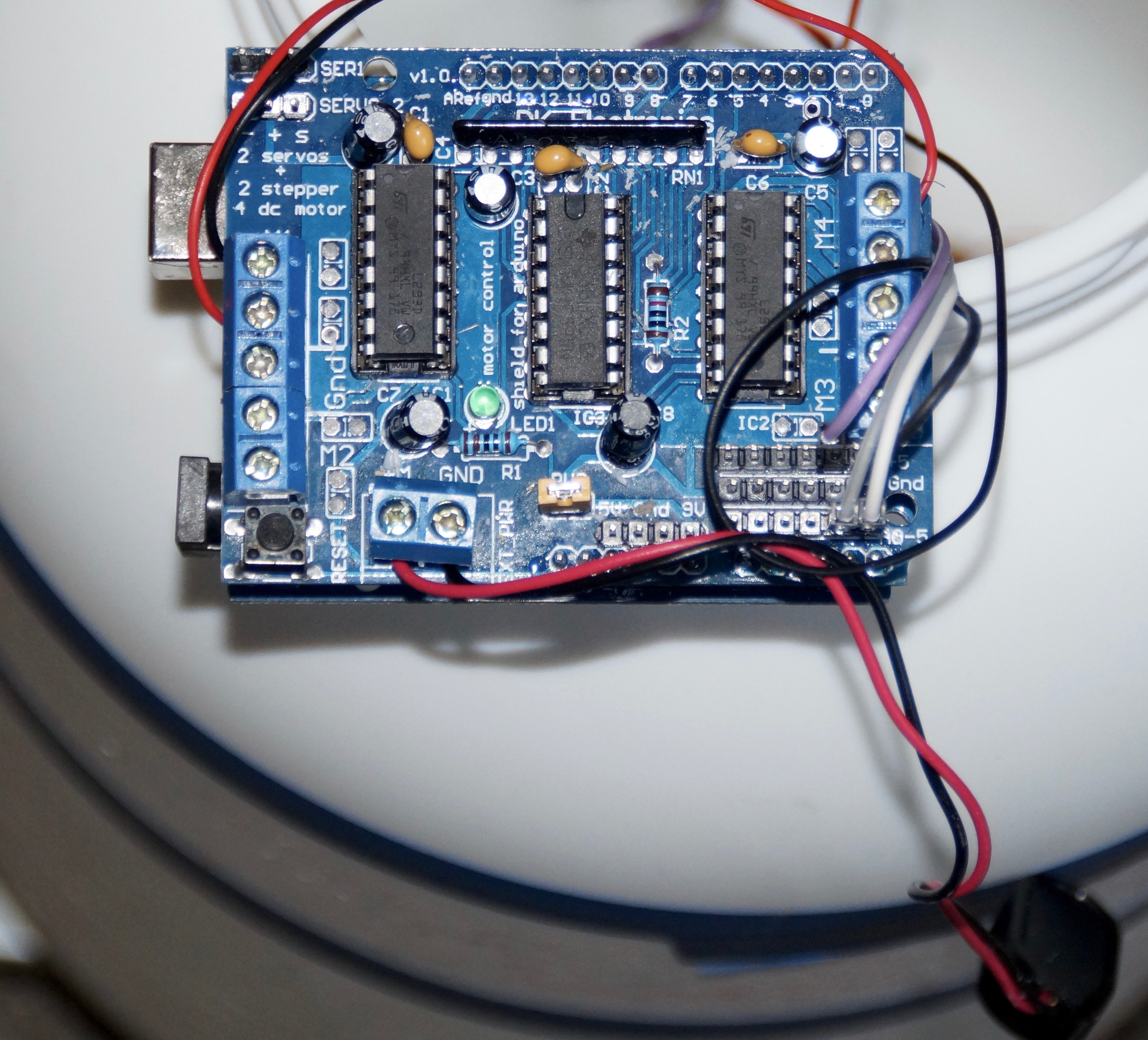 De draadjes zijn verbonden met het motor shield van de arduino (microcontroller)